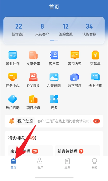 2、在首页查看今日待办任务,及时处理客户跟进提醒。