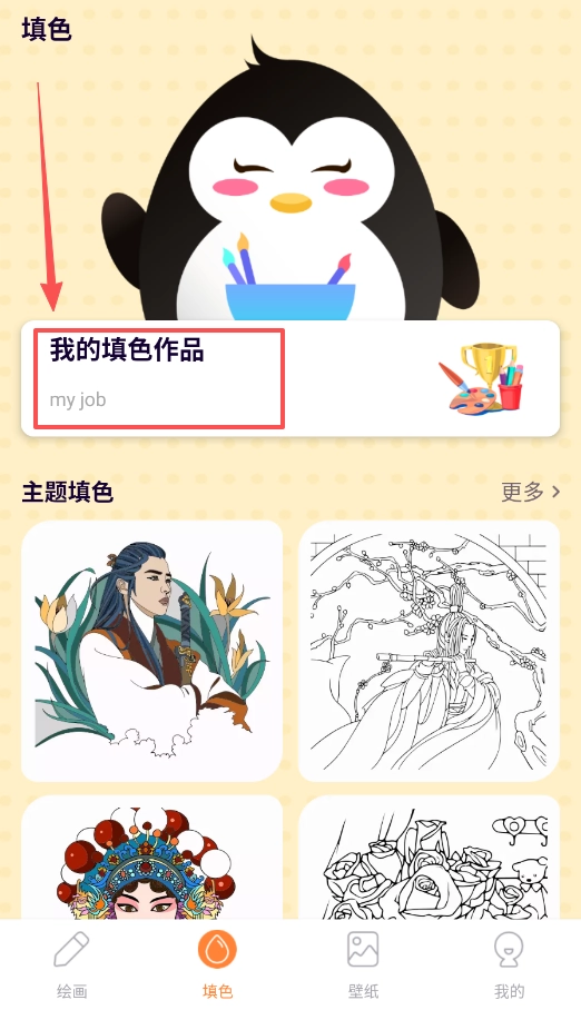 3、“填色”功能适配偏好舒缓创作的用户,页面会呈现你的“我的填色作品”,下方设有多样的“主题填色”分类。
