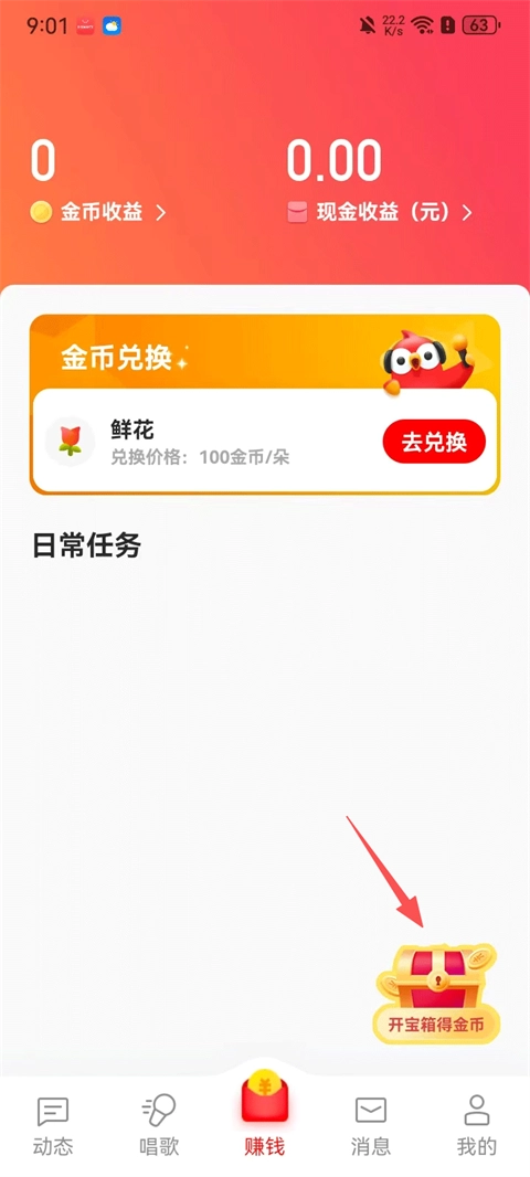 1、打开全民K歌极速版,点击赚钱-开宝箱得金币;