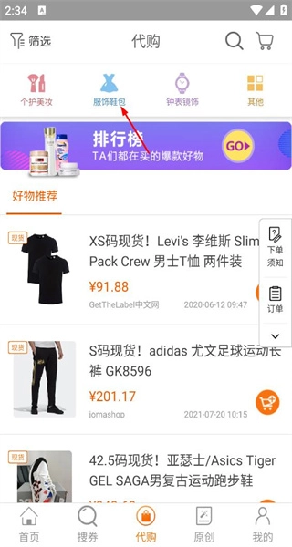 打开软件进入首页后,浏览小编精选的商品列表,接着点击代购选项,即可进入代购分类页面。