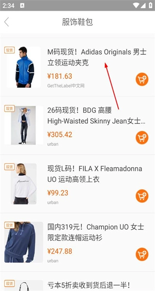 3、进入服饰鞋包的商品列表页面,浏览各类服饰商品后,挑选Adidas品牌的立领运动夹克并进入该商品的详情页。