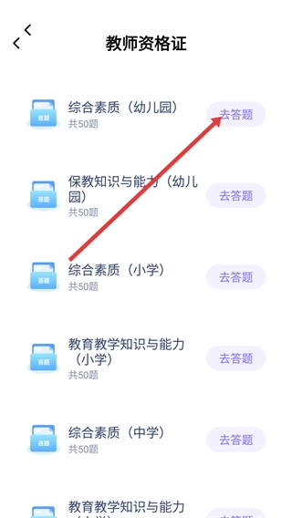 2、进入【教师资格证】页面后,找到【综合素质(幼儿园)】右侧的【去答题】按钮,点击该按钮就能进入该科目的答题环节。
