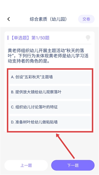 3、进入【综合素质(幼儿园)】的答题页面后,查看单选题的题干与各个选项,选定相应答案,接着点击【下一题】按钮,即可继续进行答题操作。