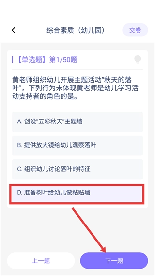 4、选定单选题答案(例如选项D)后,点击【下一题】按钮,即可进入第2题的作答环节,按此方式逐步完成50道题的练习。