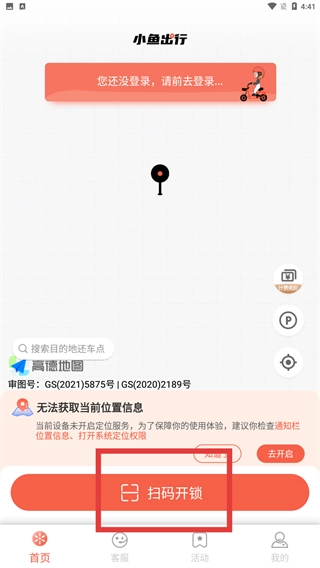 4、登录后,在首页找到并点击【扫码开锁】按钮,接着用设备扫描电单车上的二维码,就能解锁车辆开始使用(使用前请务必确认设备的定位权限已开启)。
