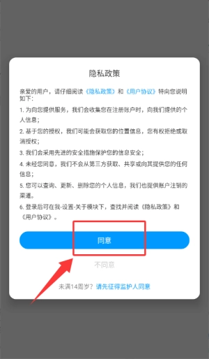 1、在隐私政策提示中点击"同意",即可进入应用。
