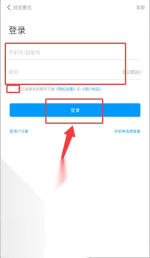 2、输入手机号或超星号以及密码,同时勾选相关协议,即可完成登录操作。