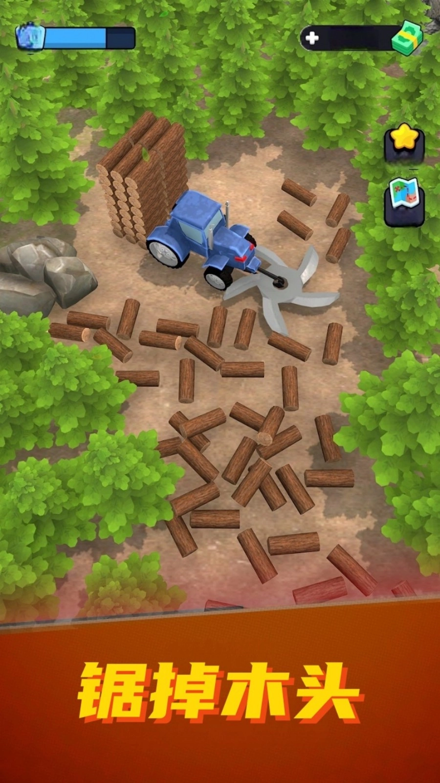 2、手动砍伐初始林地的树木获取原木,这是搭建木材帝国的首个环节,需快速积累第一笔启动资金。