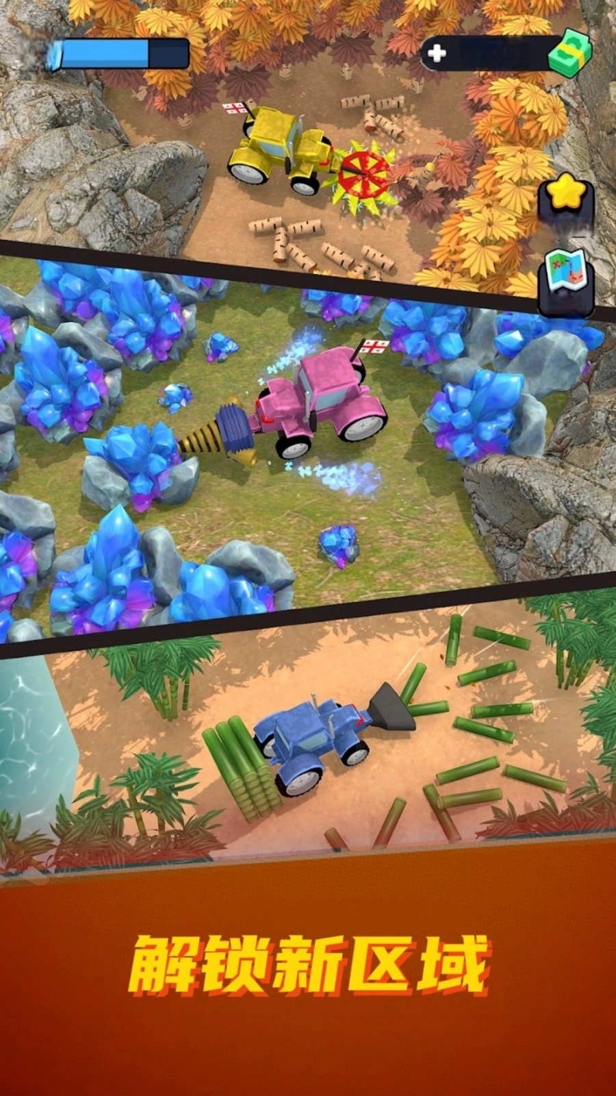 2、从初始森林出发,逐步解锁山脉、荒原等多样化地形,每个场景都配备专属树种与稀有资源,需要根据地形特点调整相应的伐木策略。