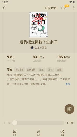 7、平台支持免费听书功能,提供智能朗读与真人讲书两种模式,更有多种不同音色可供选择。