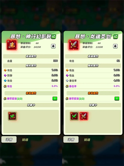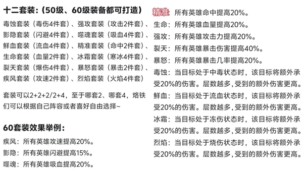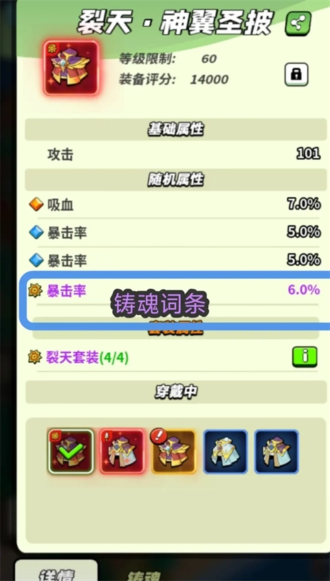 装备铸魂不仅具备套装效果,还会随机附加一条装备词条,涵盖爆伤、攻击、攻击百分比、血量、防御,以及各系英雄的攻击加成、冻伤、流血等类型。具体可参考下图:
