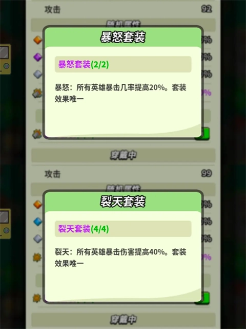 第一种搭配方案:暴击两件套(暴怒套装)加上爆伤四件套(裂天套装)