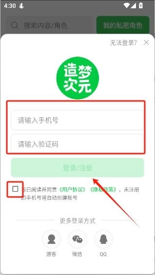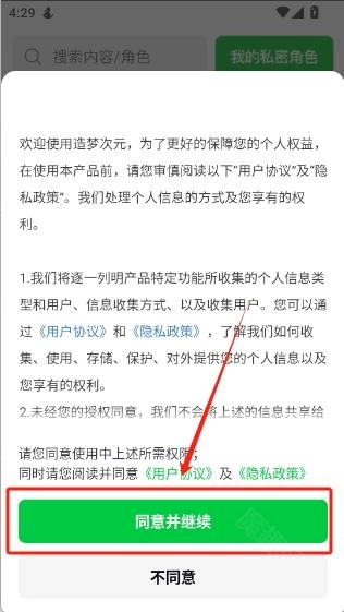 1、并打开造梦次元,点击“同意并继续”