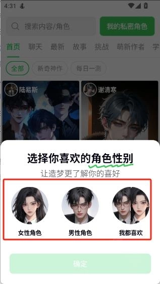 3、选择你喜欢的角色性别,然后点击“确定”