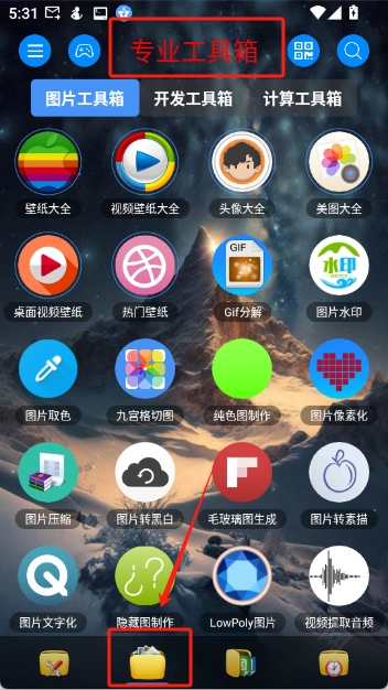 4、首页底部的第二个图标,为大家提供了各类专业工具箱,像图片工具箱、开发工具箱、计算工具箱等。