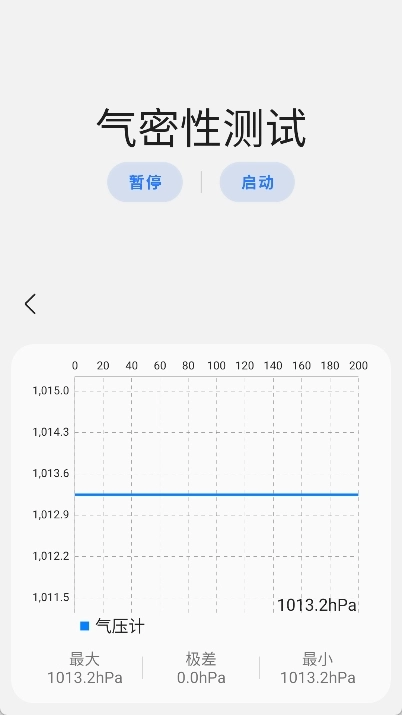 - 气密性测试功能:具备暂停与启动切换(便于截图操作),能自动计算压力范围,实时展示最大及最小压力值;输入入口可通过首页顶部的对应图标,或电话界面右上角的相关按钮进入。