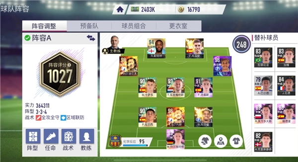 替补球员名单及评分如下:比塞克75分、姆希塔良82分、德芙赖82分、帕瓦尔83分、达米安81分、弗拉泰西80分、塔雷米90分。