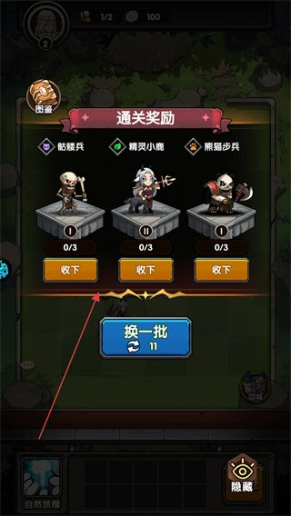 4、通关之后,可以选择领取骷髅兵、精灵小娜、熊猫步兵这类奖励,以此来提升我方的战斗能力。
