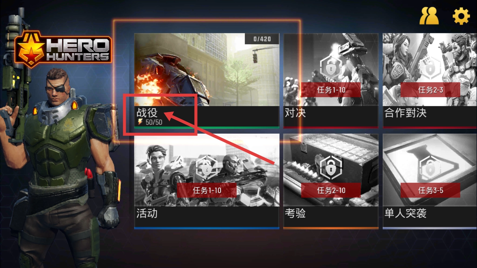 1、进入【Hero-Hunters】后,建议优先选择【战役-50/50】模式,跟着剧情一步步推进,这样能解锁更多游戏玩法,还能积累初期需要的资源和经验。