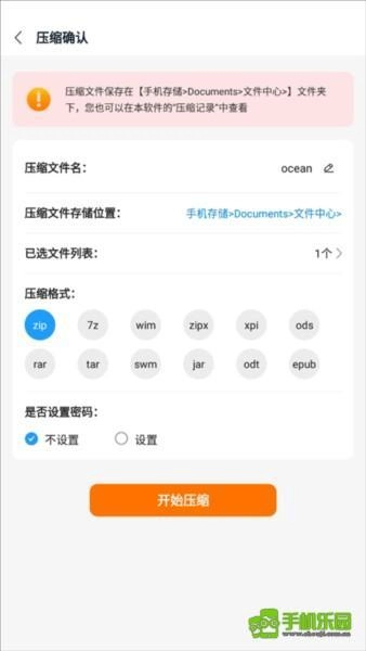 4、你能够自行选择压缩文件的名称、存储位置、压缩格式以及加密密码,待这些设置都完成后,点击开始压缩按钮就可以了。