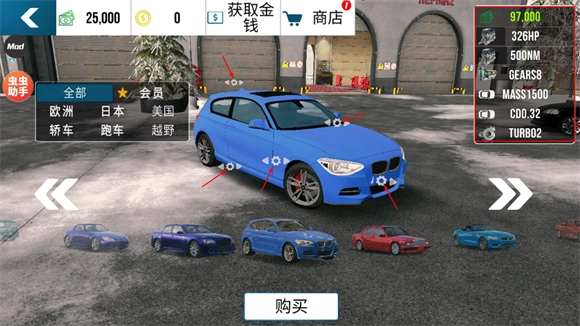 4、选购车辆时,界面右上角会显示该车辆的价格与各项属性信息;车辆上的齿轮图标,则代表着可进行更换的部件。