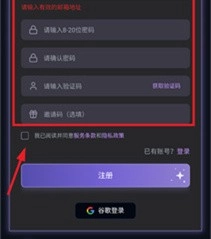 3、若没有账号,可进行注册操作,输入邮箱与密码后,点击同意相关事项即可。
