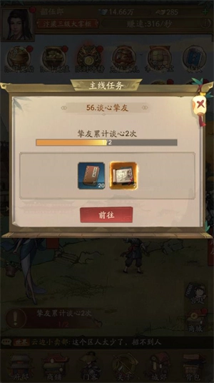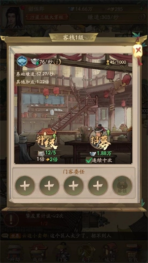 4、提高自身的角色等级能够解锁各类门客角色,这些门客能够助力你获取更多收益。