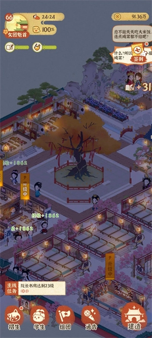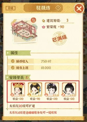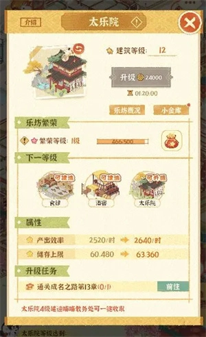 1、太乐院升级:太乐院作为城建的核心建筑,是解锁其他建筑建造权限的前提——唯有先升级它,才能推进乐坊的壮大,坊主们可别忘多提升太乐院等级呀~ 随着坊主用心经营,太乐院等级提高后,还能通过其功能界面查看哪些建筑同步具备升级条件,方便提前规划资源与学员安排;毕竟建筑等级提升后,经营效益也会跟着涨呢!