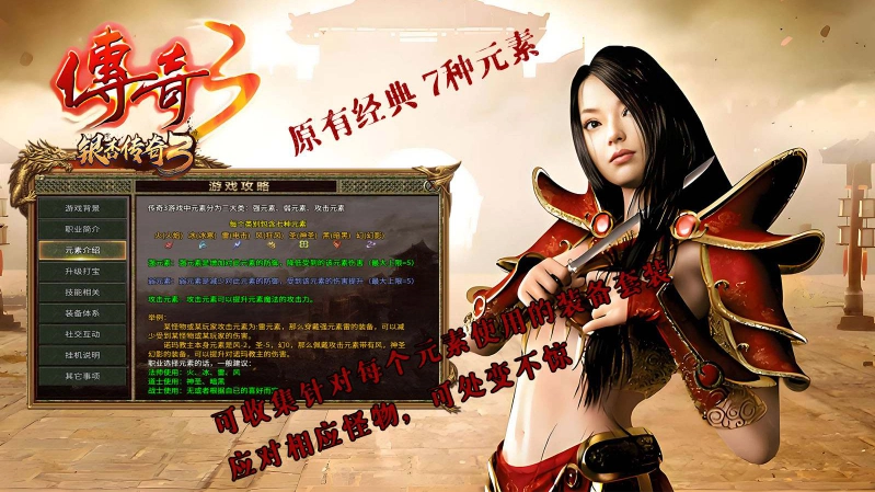 在传奇3游戏里,元素系统被划分为强元素、弱元素和攻击元素三大类别,每个类别下都涵盖了火(火焰)、冰(冰寒)、雷(电击)、风(狂风)、圣(神圣)、黑(暗黑)、幻(幻影)这七种具体元素。