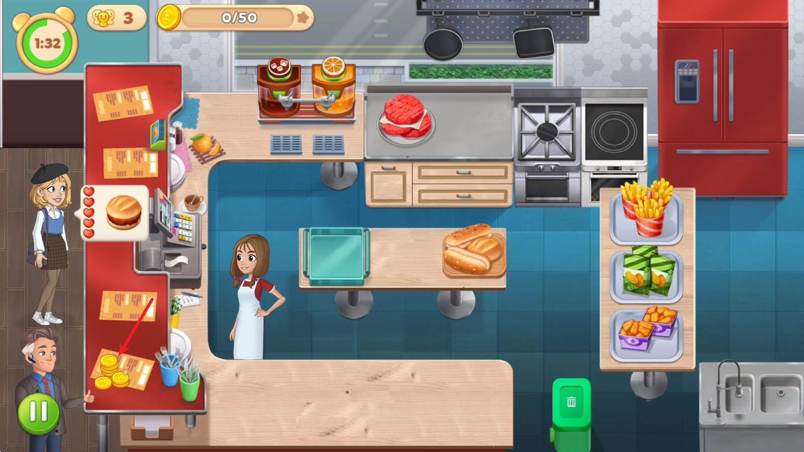 制作完成后点击就能拿到,接着点击客人的菜单提交,就能获得相应奖励。