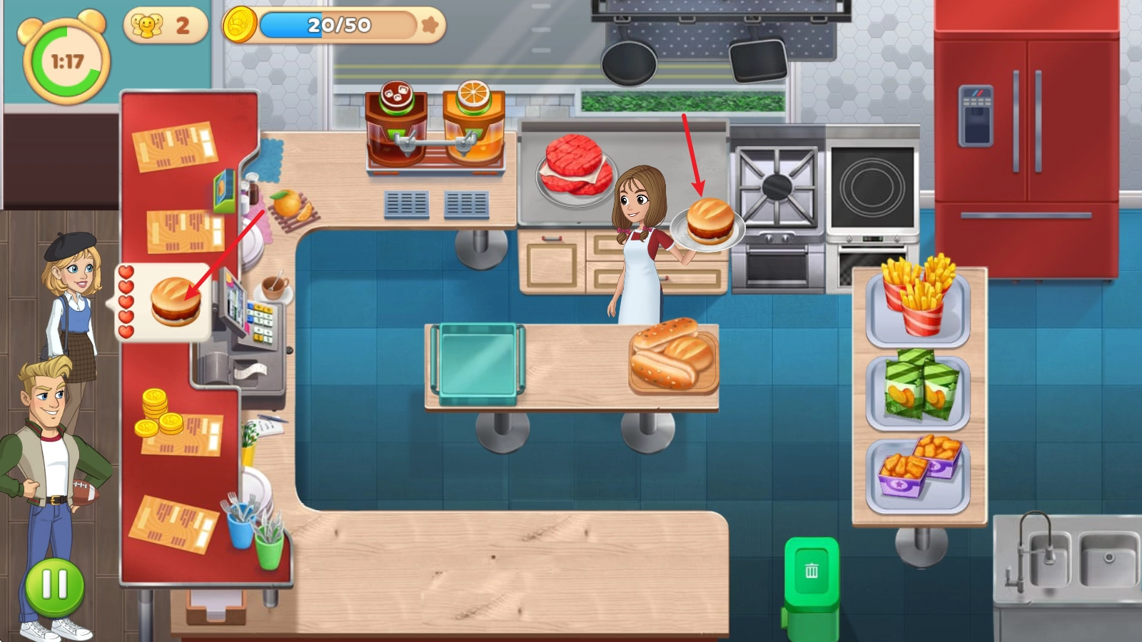3、主食汉堡的制作步骤相对复杂,需先点击肉饼进行煎制,之后再点击面包,这样就能制作完成了。