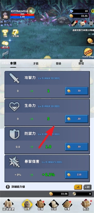 2、随时可以升级一下角色属性,比如攻击力、生命力、防御力等,消耗一些金币即可。