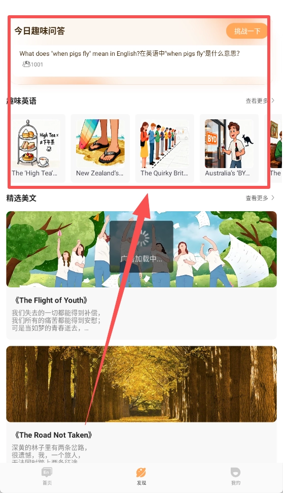 3、可以在发现内查看更多趣味英语内容,也可以查看精选内容,阅读更丰富的内容。