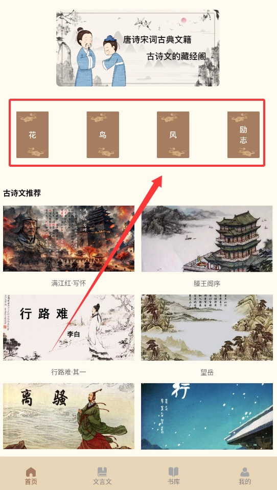 1、打开进入首页,就能看到清晰的功能栏,比如首页文言文书库等,轻松点击就能探索不同分区了。