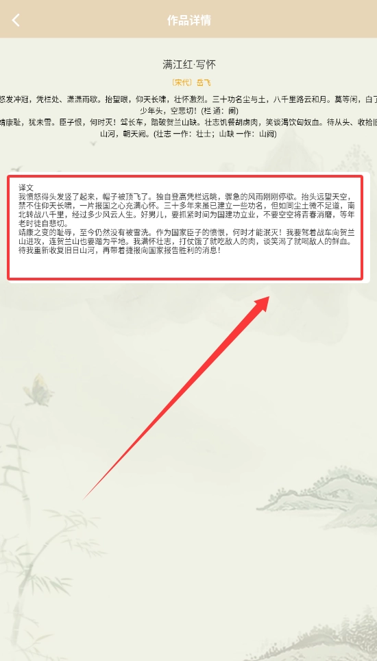 2、想学古诗词呢,点开推荐的诗文如满江红,原文和详细译文左右对照,理解起来很方便的哦。