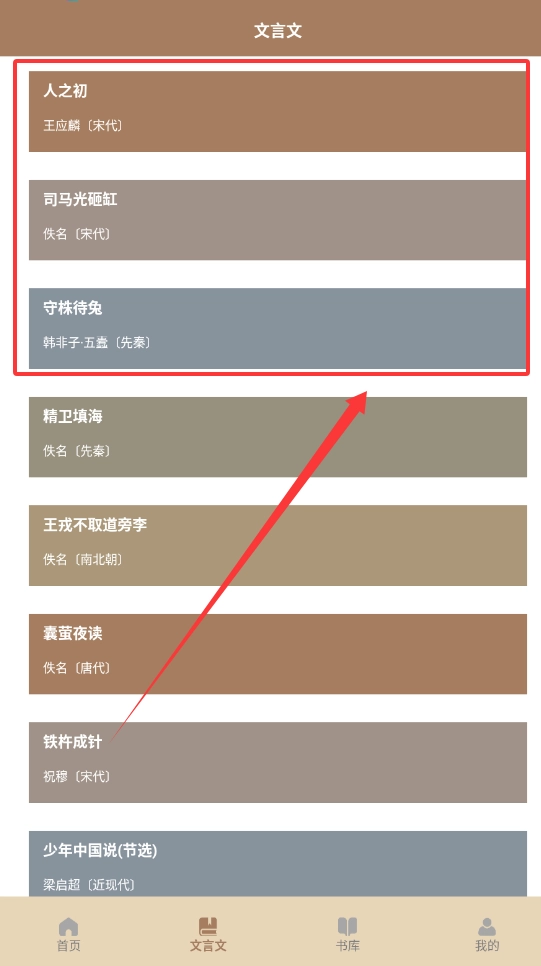 3、查找文言文的话,切换到文言文板块,列表里有按朝代和主题分类的名篇,像守株待兔等故事随手可读。