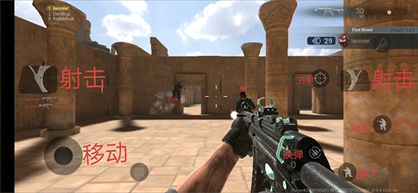 匹配成功后会直接进入游戏,之后可以通过左下角的轮盘来操控角色移动,左右两侧的扳机键分别对应射击功能,此外还有换弹、蹲下、跳跃等按钮,玩家可借助这些操作来击杀敌人。