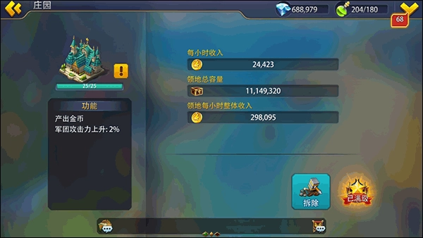 庄园具备提升金币产量、增加领地金币存储上限以及加快军营训练速度的功能,游戏初始阶段就能建造,但只能建在内城、沼泽、雪地、火山这四种图块上,最多可建造17个,并且和军营、医疗所共享最大建造数量的限制。军营、医疗所和庄园都可以进行拆除操作。建造或者升级庄园时,需要消耗普通资源和一定的时间。