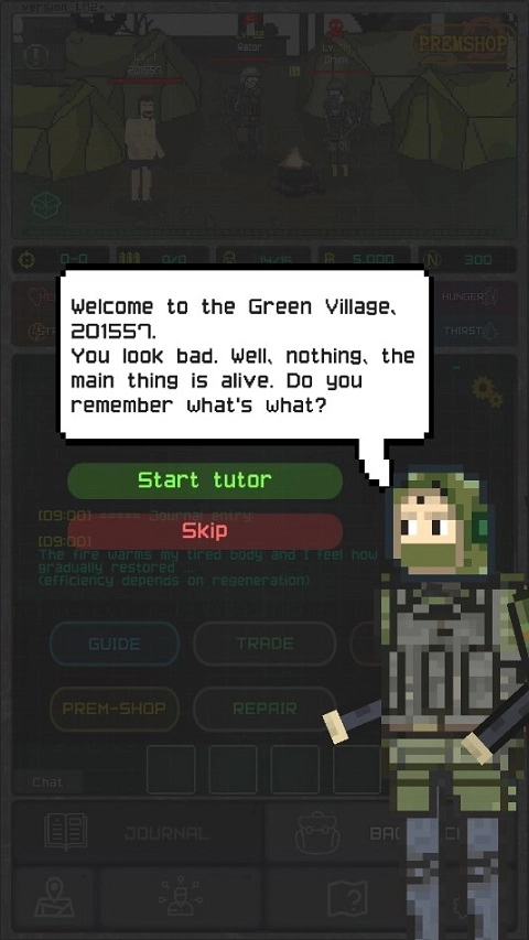 游戏刚开始会有新手引导,不过因为是英文界面,这里我就先不展开讲了。我自己选的是前军人角色,主要是看中军人有较高的体力和不错的敏捷性,美中不足的是智力和运气这两项技能比较欠缺。