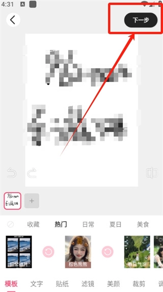 3、导入操作完成后,系统会自动跳转至图片编辑界面。在此界面中,用户可借助软件的各类模板、滤镜等功能对图片进行编辑处理。编辑工作结束后,点击界面右上角的“下一步”按钮即可继续后续流程。