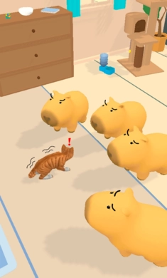 玩家能够借助喂食、清洁、互动玩耍等途径照料卡皮巴拉,以此提高它们的幸福指数。