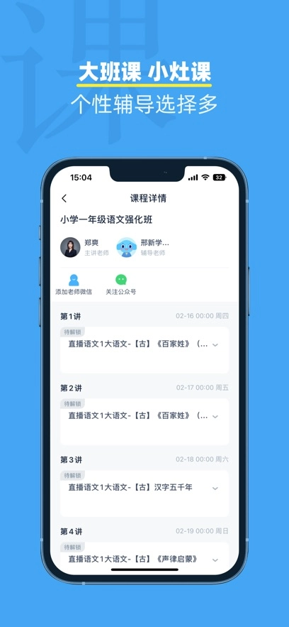 班级管理:建立虚拟班级,配备主讲老师和辅导老师。