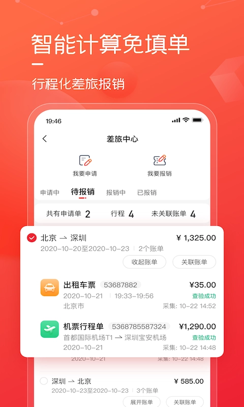 自动生成报销单据,达成“机票+酒店+用车”一站式行程报销