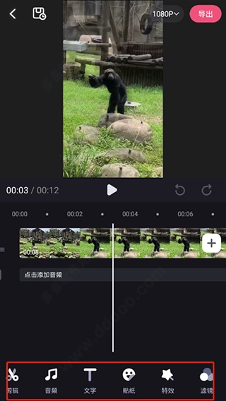 4、在下方可以对视频进行剪辑、音频、文字、贴纸、特效、滤镜、画布等设置。