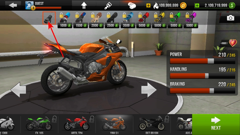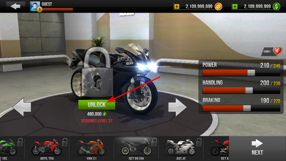 点击UNLOCK按钮,就能解锁全新的摩托车,这些新摩托车在动力和属性方面更有优势,能够提升驾驶体验并提高完成效率。