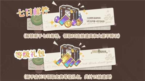 完成引导任务、提升等级并累计登录七日,通过【七日邮件】与【免费等级礼包】可获得约35次抽奖机会及400个不醉石。