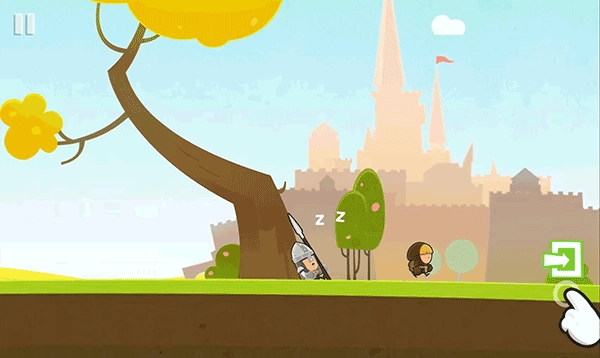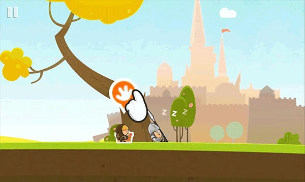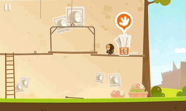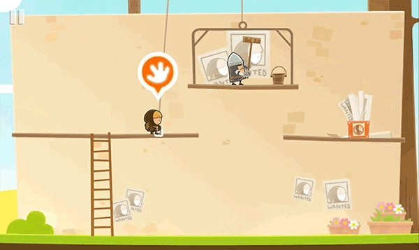 把角色移动到图里指定的位置,接着点击画面中的手掌图标,绳子就会解开,位于中间的平台随即坠落。