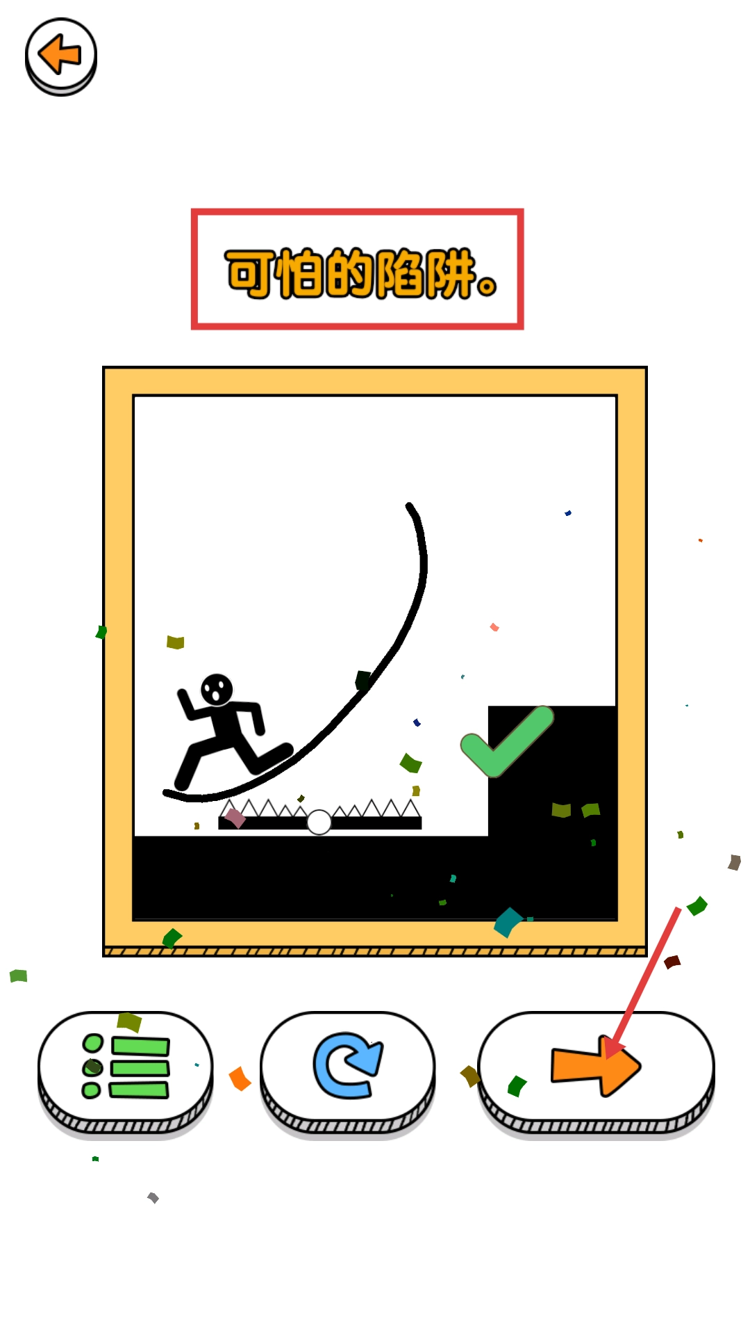 成功闯过【可怕的陷阱】这一关卡后,点击橙色箭头按钮就能继续挑战,进而逐步解锁更多趣味关卡。