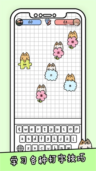 突破传统打字游戏的单一模式,将打字与猫咪消除玩法巧妙融合,新意十足;萌趣的猫咪元素搭配紧张的竞技比拼,让原本枯燥的打字过程变得生动有趣,不再乏味。
