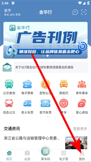 1、打开金华行,首页点击底部我的,进入我的页面。
